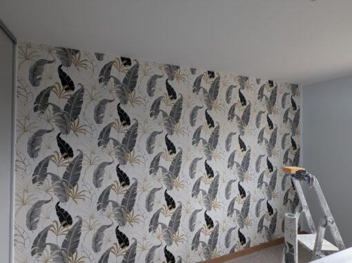 Avant la pose, nous préparons minutieusement les surfaces : nettoyage, ponçage et application d’une sous-couche si besoin, pour garantir une adhérence parfaite. Nous travaillons avec des papiers de qualité, faciles à manipuler, parfois repositionnables, pour vous assurer un résultat impeccable.